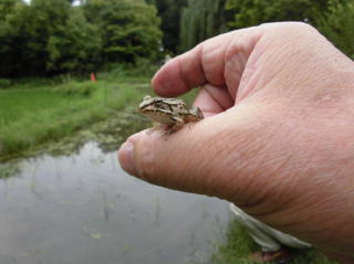 午後からは鶴見緑地・自然体験観察園へ移動。木々に囲まれた自然体験観察園の田は水を一年中張る事でいろいろな生き物が現れるようになり、見つかる種類は年々増えているとの事。トンボの交尾、産卵をしている様子、バッタが脱皮しているのも見られた。ハイイロゲンゴロウ、オオアメンボ、シマアメンボ、ヒメアメンボ、ヒメイトアメンボ、コミズムシ、カエル、オンブバッタなどが見られ説明を聞きながら観察する。アメンボは臭いがすると言われオオアメンボを捕え臭ってみるがよくわからない。