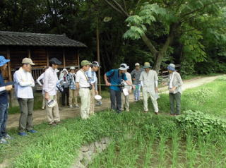 小雨降る中で講座がスタート。約40年間深泥池の観察・保全活動を続ける竹門先生から、深泥池が国の天然記念物に指定され、14万年の歴史があり、9ヘクタールの広さで、流入河川がないため水質は酸性で貧栄養との概要説明。