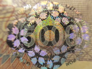 (A)5,000円札の左下側にあるホログラム保護シールをマクロ撮影したもの。