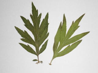 西登山道を植物ガイドブックを手に説明を受けながら山頂へ向かう。クガイソウ(葉が輪生)とルリトラノオ(葉が対生)の見分け方、ヨモギ(食用、葉柄の基部に托葉と呼ばれる小さい葉が付く)とオオヨモギ(イブキヨモギ、もぐさ用、托葉が付かない)の見分け方(写真参照)。コオニユリ、カワラナデシコ、キンバイソウ、ヤマホタルブクロ、イブキトリカブトなど植物ガイドの夏編と薬草編の植物の大部分が観察できた。