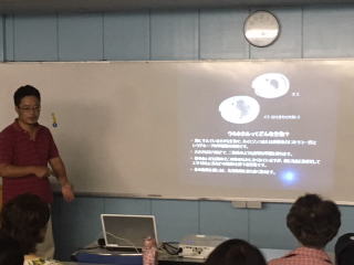 今回は初めての夜間講座。前半はウミホタルの構造や生態を学ぶ。