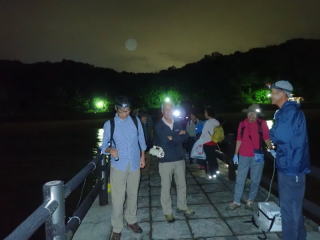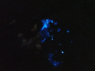ウミホタルを始めて見る方がほとんどで、早く見たいと一同満を持して砂浜に。持参した仕掛けを海中に投じ、待つこと約20分。仕掛けを引き上げた直後は採れたかどうかわからなかったが、刺激を与えたり仕掛けから取り出すとたちまち青紫色に発光し歓声に包まれる。「孫にも見せてあげたい」との声も。