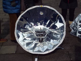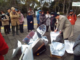 野外でのソーラークッカー【太陽光だけで調理する道具】の実演販売、訂正実演学習が行われた。パラボラ型など8種類の説明があり、巌先生制作のソーラークッカー“ききょう”を作り方の資料もあり一度作ってみようかな!