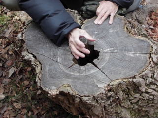 樹木も芽、枝、幹、根など普段何気なくながめて見過ごしているが、枝の伸び方で陽のあたり方まわりの木との関わりがわかる。幹のコケの生えている状態で雨水がどのように落ちてくるかなどもわかる。クスノキの下に枝が落ちているのは、成長が早くそのままでは茂りすぎるので自分で枝を落としているとの事。切り株からも成長、傷、周りとの関係などいろいろなことがわかる。