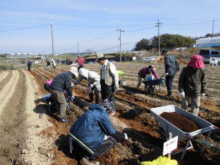 午前中は北阪農園でジャガイモの植付、畑の石拾い、馬糞堆肥の運搬散布を体験。先ずジャガイモの植付から作業開始。深さ15㎝に掘った畝の溝に、30㎝間隔に置き間に牛糞と化成肥料を施し土を7㎝程度乗せ畝を均す。