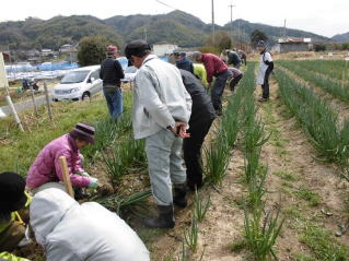 ゴールドファーム特製の沢庵を試食して午後の体験場所、神於山農園へ移動。前回(9月)に植え付けた難波ネギの収穫作業。自分たちが植え付けた線香の様に細いネギが、目の前の青々と立派に育ったネギとは思わなかった講座生もいて皆歓声を上げていた。「最近マスコミにも取り上げられるようになり難波ネギの知名度上がってきている。植え付け時期、肥料の種類を変えるなど試行しながら栽培をしている」との事でスタッフの方々の大変さを感じました。