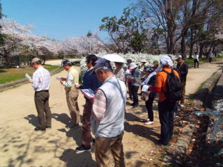 昼食後、スタッフの方々からの「鳥のおしっこはいつするの」「裸地に最初に生える植物は」などのクイズを楽しみ星田妙見宮へ。途中ナラ枯れの木が目に付く。大木にキノコがびっしりとついていた。痛々しい何か良い手立てがないのかと感じる。妙見宮から妙見河原のほとんど散ってしまった桜並木を通り私市の駅へ、本日の講座を終わりました。