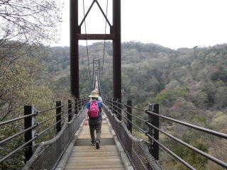 休憩時、ヤママユガの仲間の「ウスタビガ」の綺麗な緑色の繭を見せてもらう。途中モミジの枝にぶら下がる繭を見つける。双眼鏡で見ると下の方に、雨水を落とす穴が開いているのがはっきりと見えた。急な道を登り星のブランコへ。長さ280m高さ50mの吊り橋、眼下の素晴らしい眺めを見ながら全員渡ることができた。