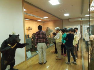 レクチャールームで「動物の餌とウンチ」の話からスタート。ゾウのウンチは一個1㎏程の重さがあり、“これがそうです”と標本を出してもらった時は“ギョッ!”ご安心を本物でも乾燥しており触っても大丈夫。