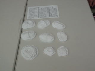 シリコン製の化石の型を使いレプリカ造りを体験。先生の説明を聞く前に作業を進めて注意を受ける場面もありましたが型に石こうを流し込み固まるのを待つ。「うまく出来てますように」と型から石こうを取り出し結果、全員が素敵なレプリカが完成。各自が作ったレプリカの作品シールを頂き持ち帰った。