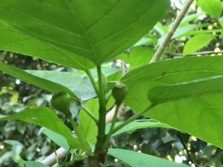 ヤマモモは雌雄別々の木。その葉に光を当てれば葉脈が透いて見える。(ピンボケですが、黄砂の影響ではありません