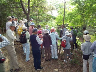 午後は光明池緑地に出かけゆったりと観察。ケヤキの葉に寄生する「虫こぶ」からスタートし、アラカシの葉の特徴や名前の由来(アラは「粗」で、割れやすく使えない木だから)を聞く。途中、アカガエルの大合唱に迎えられ、その美声に聞き入る(?)。さらにムクドリがその実を好むムクノキの幹や葉の特徴や、枯れ葉が折り重なる「林床」は光が届かないため他の植物の侵入を防ぐと聞き、皆さん納得顔。最後にイヌビワは虫と共生しているため、実の中には虫がいると聞いて一同びっくりしたところで締めくくり。