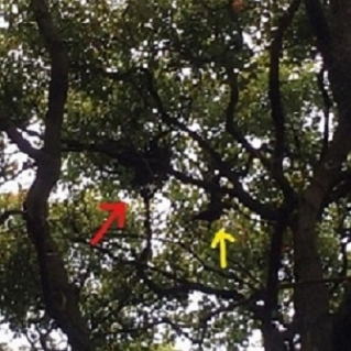 わかりにくいですが、ハシブトガラスの巣(赤矢印)と巣立ちビナ(黄矢印)。高い所を見すぎて、「首が痛~い」の声も。