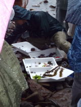 豊国崎では磯の生き物採集。サンダル履きの人、手袋をした人、素手の人思い思いのスタイルで自然の海の生き物探しが始まりました。雨の中での採集のため、生き物を見つけるのに悪戦苦闘。しかし、40分程度でミズクラゲ、イソガニ、ゴカイ、ウニ、カメノテ、フナムシなど30数種類を採集。ババガセ【婆背】面白い名前の生物も。
