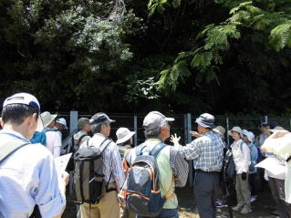 梅雨とは思えないさわやかな快晴のもと観察を開始。大阪で唯一残っているウバメガシの海岸林、トベラ、シャリンバイ、カクレミノ、サンゴジュ、マサキなど乾燥に強く、厳しい環境でも生育できる樹木の説明を受けた。これらの樹木は都市公園、街路樹にも多く植えられているとの事。