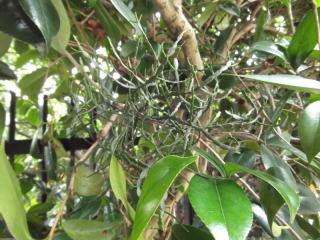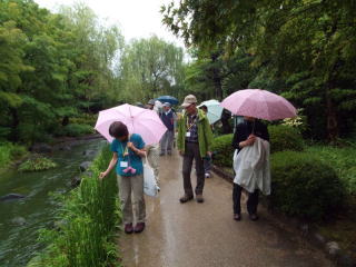 午後は雨が降っていたが日本庭園を散策しながら木々の説明を池田先生から受ける。松の葉は2つの細長い葉が付け根で合わさってV字型になっていますが付け根の茶色い部分は葉ではなく松の短枝だそうである。松の枝を観察してみて下さい。椿の枝の上に寄生植物のヒノキバヤドリキを見ることが出来た。ヒノキバヤドリキは葉緑体があって光合成し寄生した植物からは水と無機塩類だけを吸収するので厳密には半寄生植物である。