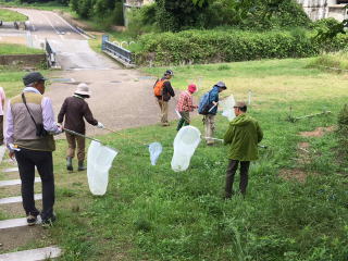 午後は雨が上がりさらに晴れ間も出る絶好のコンディションの中でフィールドでの昆虫採集がスタート、うまく網が使えなかったり恐々昆虫を網から取り出す方もいたが、皆さん童心に帰り、汗びっしょりになって昆虫と追っかけっこ。数十種類の昆虫を採集できたが、最後に図鑑とにらめっこしての同定作業が難しく、先生は引っ張りだこだった。