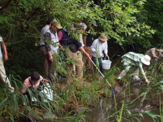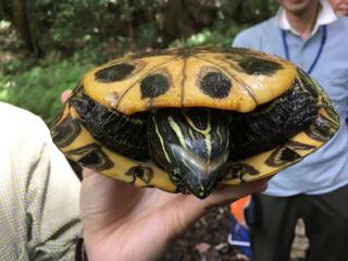 午後はフィールド観察、獲物は少なかったが、それでも網を振り回し草をかき分け、みんな汗びっしょりになりながら夢中で探す。ヌマガエルやトノサマガエルのオタマジャクシの中には一部、足が生えかけているものも。成体のヌマガエルは座学で教わった通り、確かに前足が4本・後ろ足が5本だった。また捕獲できなかったが、行列の先頭ではニホンカナヘビやマムシも観察。特筆すべきは受講生の一人が忍者の様な俊敏な動きで捕獲した特大のアカミミガメを見て一同驚きの声をあげる。