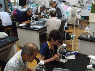 昼からは泉北高校に移動し、ビオトープ池の見学、生物の採集、植生の説明を聞いた。生物教室では顕微鏡でミジンコ、ゾウリムシやミカズキモ、ブレファリスマなどの観察することになった。久し振りの顕微鏡にみんな先生の説明は二の次で”ワイワイ、ガヤガヤ“と学生時代に逆戻りした1時間半でした。