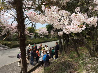 桜に囲まれて自然観察がスタート。桜の花も12期生の学習意欲も満開状態。