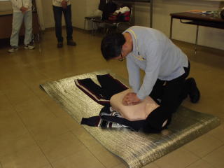 午前は傷の手当、蜂の対策、三角巾のたたみ方使い方を学び、午後は心臓マッサージ訓練器「アッパ君」と人形の「ジミー君」で一分間100回の胸骨圧迫(心臓マッサージ)を体感、ほとんどの人が息切れをしていました。AEDと合わせ救護の方法を体験し、続いての災害時の準備の話では、3分(自助)3時間(共助)3日(公助)を基準に防災用品を準備するとの事。