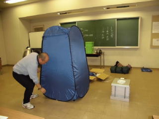 必ず付きまとう食べたら出るの生理現象、持参された災害時用の「仮設段ボールトイレとテン」このトイレ、収納時はコンパクトで組立時時間は15分もあれば充分と優れものです。欲しいと思いました。他にキャプ用テント等があればある程度のプライバシーは確保でき有用とのことでした。初めて三角巾の使い方、胸骨圧迫、AEDを体験された方が多いようで、一回ではなかなか覚えることはできませんが有事の時は少しでも役に立つことができたらと感じました。