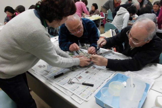 午後からは化石の型作りをする。アンモナイト2種・2枚貝のイノセラムス、プテロトリゴニアのシリコン鋳型から1つを選び石膏を入れ、石膏が固まるのをワクワクしながら待ち、化石のレプリカを作る。最後に貝の化石(岐阜県瑞浪市発掘)が詰まった石灰岩をコンクリート釘で真上から叩いて親指大の貝の化石を取り出す。私は上手く1つ取り出せた。皆さんと楽しい体験ができた。(1班作成)