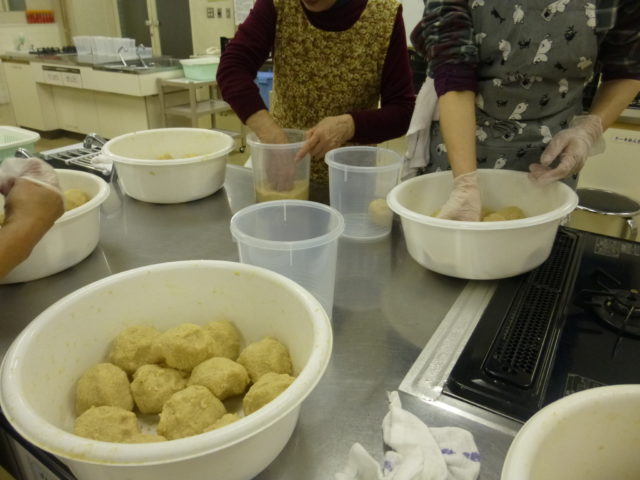 白味噌作りの材料、ミンチに仕上げた大豆(300g)と米麹(800g)と塩(110g)を用意して頂いており、時短で半日もかからないうちにみんなで仕上げることができた。手を消毒し、消毒したボールに麹と塩を入れ混ざったら、大豆を入れ、手のひらでまんべんなく全体を練り込むようにかき混ぜる。固めになれば、豆の煮汁を足してもらう。手で形づけられるまで練り、それを丸めてみそ玉とし、容器にみそ玉をギューギューと並べて隙間なく、空気が入らないように真剣につめていった。