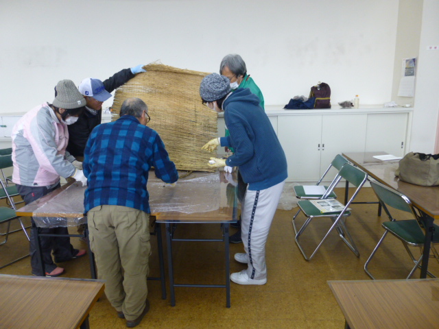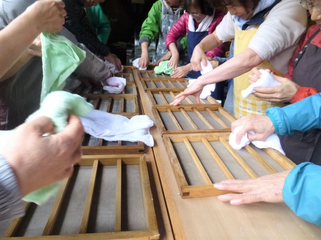 和紙は楮(コウゾ)を大釜で蒸し、黒皮を削ぎ、灰を入れて煮る、その後、叩きほぐして楮繊維にして、水とトロロアオイの粘液を混ぜて紙を漉き、天日で干す工程で作られています。紙漉きの仕方を教わり、干し板に張りタオルで水分と空気を抜く作業を経験しましたが、自分達が漉いた和紙が3月の修了証として頂けると思うと、皆さん熱心です。