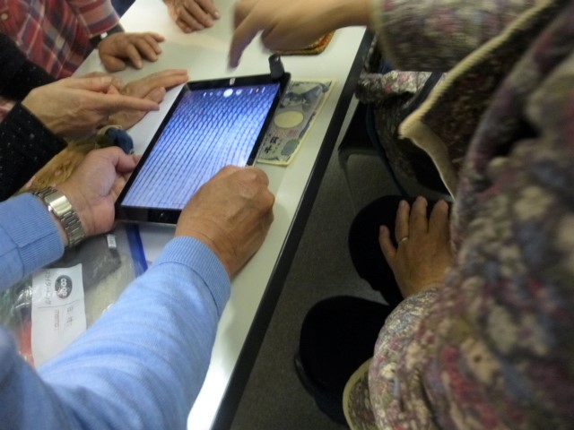 午後は、お札や微小貝のマクロの写真実習。1万円札や5千円札の数字の下にはNIPPONGINKOの文字が、肖像画の顔や眼には、模様がぎっしり。偽札なんて考えられないくらい緻密模様のお札を再発見。微小貝は、肉眼では、砂粒にしかみえないけれどマクロの世界では、貝の模様もはっきり、綺麗に光った貝を見ることが出来た。カメラのレンズも高価なものだけでなく、手軽な携帯電話やタブレットに百均のレンズをつければ、充分マクロの写真が撮れ、マクロの世界の楽しさを満喫することが出来た。(1班作成)