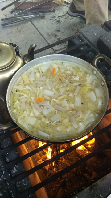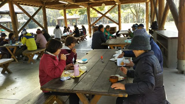 今日の講座は「信太山の自然観察と野外炊飯」です。信太山青少年野外活動センターに集合。AMはみんなで豚汁作り、PMは蝶のオオムラサキ・ゴマダラチョウの幼虫と二ホンアガカエルの卵の探索です。“サァー!”豚汁づくり開始。皆で持ち寄った材料の仕分け、男子は火おこし部隊、火の扱いに慣れているのか、鍋はすぐにグツグツと沸騰、材料を投入、あとは出来上がるのを待つだけです。ワイワイガヤガヤ楽しい料理?作り体験になりました。昼食は、豚汁と皆さんそれぞれ持参のおにぎり、美味しいおかずの差し入れ、食後のコーヒー、持ち寄りのおやつも付いて、いつものランチより豪華になりました。