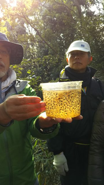 たくさんの果実を採取し、先生と一緒に移動方法について推察します。