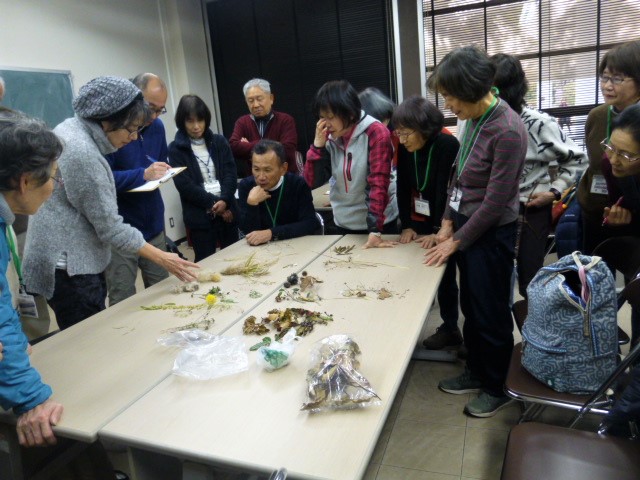 午後は当博物館の展示物を見学後、長居公園内で果実等を採取し、講義室で各班ごとに同定と移動方法の発表を行った。いろいろな果実等が見つかり、先生のウイットに富んだ講義で楽しく学ぶとともに植物のタネの多様性と不思議な生命力を感じる講座であった。(2班作成)