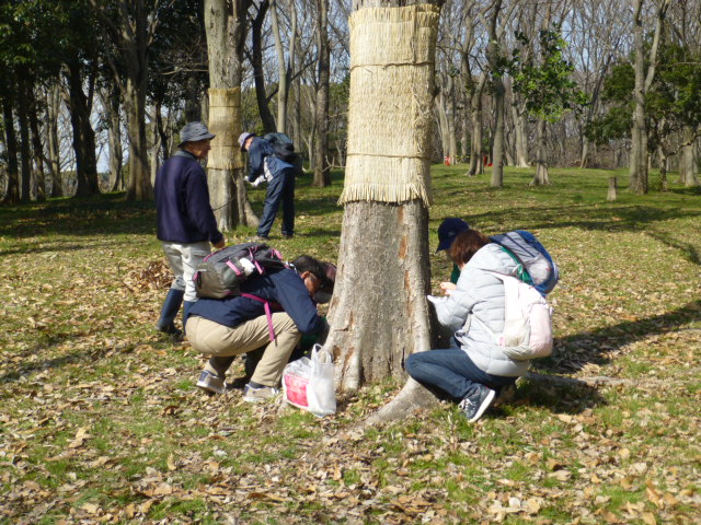午後は3班に分かれフィールドワークへ。1班クヌギ、2班ムクノキ、3班アキニレを担当。まず、菰巻をしていない裸の樹皮の間や裏にいる虫を採取。続いて菰を回収し、菰の下になっていた樹皮上の虫をすぐさま採取。部屋のテーブル上に菰を広げ、眠りから覚めて歩く回る虫を易しく、てきぱきと容器の中へ。カメムシ、テントウムシそしてクモ等沢山の種類と数多くの虫を採取した。生き物たちは冬の間も活動していた。最後に先生から「何故ここにいるのかを考えることにより観察眼が養え、そこから楽しさが生まれてくる」と教えられた。心に留めておきたい。(3班作成)