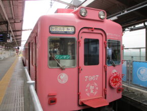 ピンク色のキュートな外装 めでたいでんしゃ