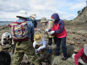 可愛いめでたいでんしゃに揺られて「加太駅」到着。城ケ崎海岸まで歩くこと30分。強風が吹き荒れ波も高い。東屋で講師より「全員見つけるまで頑張りましょう!」力強い言葉と補助してくださるスタッフの紹介のあと、ウミウシの見つけ方を教わる。潮がひいたあとの潮だまりや石の裏側にくっついているので、石をとにかくひっくり返すと見つかるそうである。磯観察で守ることは、動かした石は必ず元の位置に戻してあげること。強風の中、注意しながら海岸へ降り観察開始。石をひっくり返す作業をひたすら続けると「オカダウミウシ」「アカボシウミウシ」「クロシタナシウミウシ」「メリベウミウシ」「ユメウミウシ」「トトロウミウシ」全身がきれいな青に黄色の斑紋、それに赤い触角をもつ鮮やかな体色の「アオウミウシ」など13種採取できました。