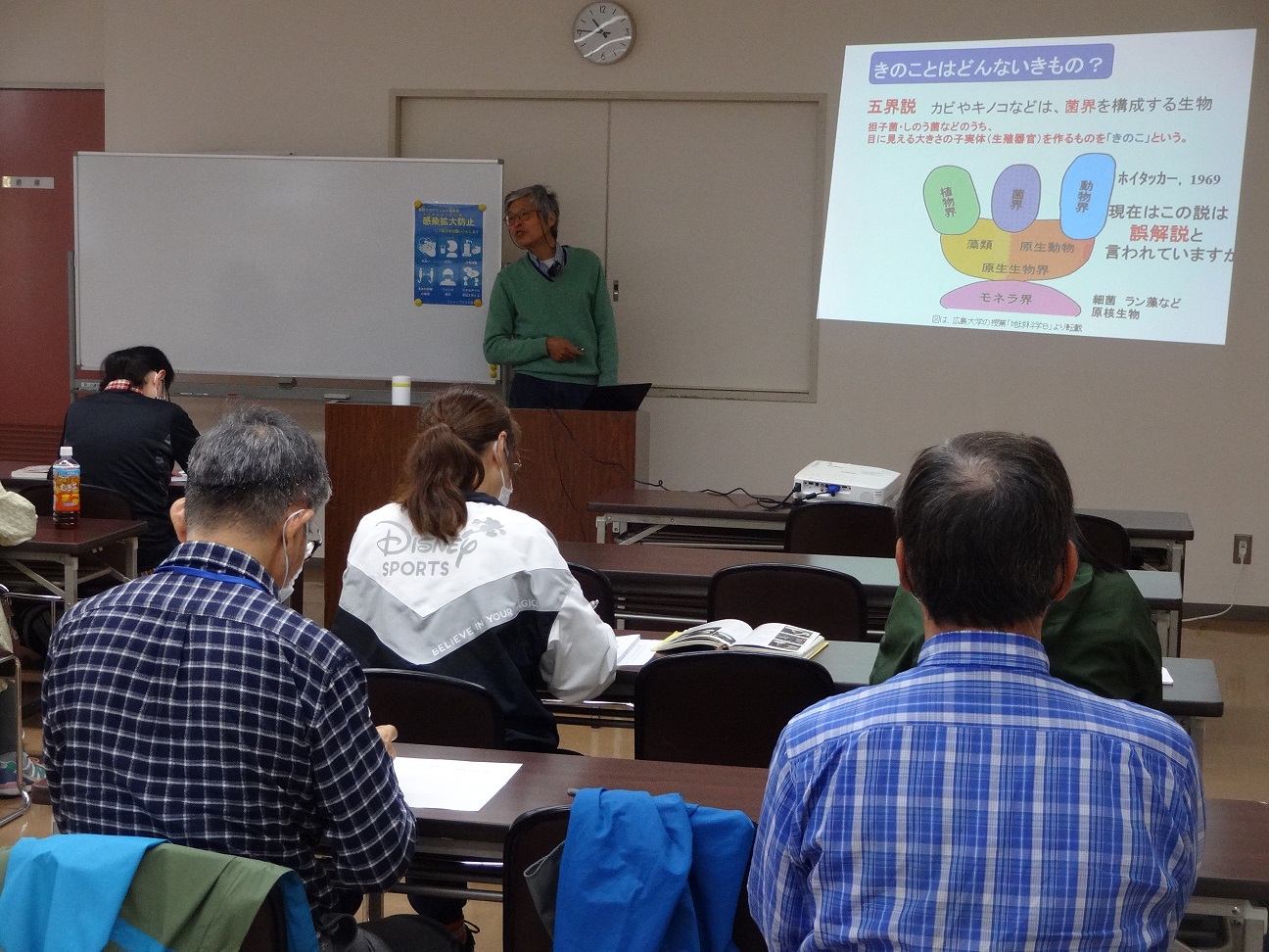 14期生は2年ぶりのキノコ観察講座です。午前の座学では先生から「前回説明したことを覚えていますか」との質問に皆さん顔を見合わせ苦笑い。前回の復習としてキノコとはどんなものか、分類や役割、生え方や調べ方から毒キノコの見分け方そして関西でよく見られるキノコを映像で説明してもらいました。先生はベニタケを研究されていますが、今年新しい種類を発見し「リュウコクヒメベニタケ」と命名して発表したそうです。