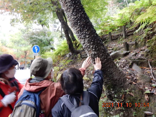 2年ぶりの奈良の巨樹観察講座で南部遊歩道・滝坂の道を予定していたが、荒れていて危険とのことで北部に変更した。当日朝まで雨が降っていて、心配しましたが幸い止んでくれました。春日大社本殿前に樹齢700~800年のナギの木に感嘆の声と一言主神社での一言御参りからスタートした。水谷神社横のイブキ(ビャクシン)の巨木に圧倒され、フジが巻き付いても頑張ってるケヤキを見ながら遊歩道に入っていった。ブツブツ木肌のカラスサンショの自分の身を守る術と触ったらとても痛い感触を実感し、えぐい意味から来た磨りつぶして魚釣りに使うエゴノキの丸い実、傷口を守るモミのヤニはモミの涙と言い、セメダインの匂いがしました。ここ春日山原始林は世界自然遺産ではなく、文化遺産に登録されているのは何故か?それはこの森は東大寺、興福寺、春日大社の修験の山であり、人の手が入っていた為、との事。(なる程・・)