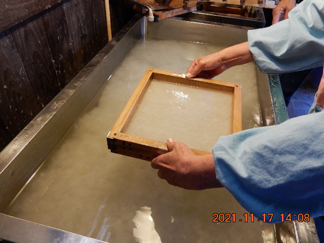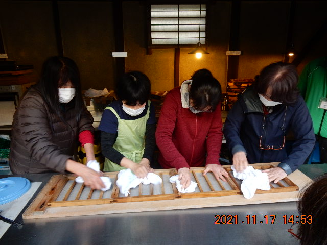 午後から紙すき体験の開始です。弘法大師から伝えられたとの「高野紙」の説明、原料の楮(コウゾ)木を釜で蒸し、皮をはぎ、灰で煮る、叩いてほぐして繊維状にし、水に溶かして最後に粘液状のトロロアオイを入れて粘り気を付けての工程を経てやっと紙すきができる状態となる。我々はこの紙すきのみの体験だが、材料を準備する苦労がよく分かった。さあ、紙すき体験の開始です。奥から手前への引き方、枠を水平に、厚みを均一になど先生の付きっきりの指導でなんとかすけた後は天花粉を塗った長板に乗せ、しっかりタオルで拭いて乾燥させる迄たどり着けました。皆さん真剣に取り組んでましたネ。完成した紙は思い出の講座修了証書となることでしょう。帰路は名産の富有柿を買って一路九度山駅へ。(hiro)