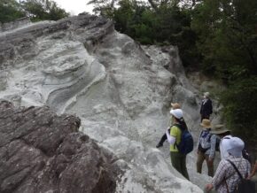 午後からは二上山博物館で凝灰岩・サヌカイト・金剛砂など二上山の石を見学した後、皆さんお待ちかねのドンズルボーに移動です。ドンズルボーでは火砕流堆積物の観察から始まり、火砕流の中からガスが激しく上昇すると軽いものは上に、重いものは下に沈むので下部に重い岩片の大きいものが多く、上部は小さくなるということや流れた方向などを地層を見ながら解説してもらいました。先生から豆石(火山豆石とは細粒火山灰が湿気の多い噴煙の中でくっついてできた5ミリ程度の大きさのもの)を探してというリクエストに皆さん戸惑っていましたが、豆石のある凝灰岩の地層を教えてもらい目を凝らして探し見つけることが出来ました。何層にも重なった火山灰や火山岩の地層をみて太古の火山活動に思いを巡らせたところで雷雨となり、残念ながら講座終了となりました。(T.K)