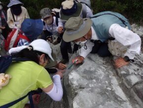 西登山道から「伊吹山お花畑植物ガイド」を片手に山頂向けて植物観察スタート。優しいピンク色のカワラナデシコ、葉先が3裂になっているアカソの群生の中にひっそりと咲くシモツケソウ、葉が輪生の薄い紫色のクガイソウ、低木の下にキヌクソウ、白くかわいいヤマホタルブクロなど、次々に出合う植物に興味津々の受講生は写真・メモと忙しい様子。途中雨が降り出したが観察を続け山頂へ。小雨と風の中での昼食後、黄色が鮮やかなキンバイソウ、岩場に生えるハーブの香りがするイブキジャコウソウなど見て西登山道から駐車場へ向かいバスで一息つき次の目的地へ。