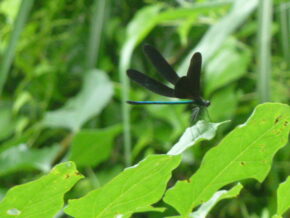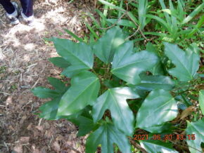 昼食後は惣ケ池湿地での自然観察がスタートしました。今の季節は花の開花が時期的に少なく、残念ながら木本主体となった。アケビ、ムベ、エノキ、葉脈が透けて見えるトウネズミモチ、シャシャンボなどを観ながら、グウチョキパーの木=カクレミノで盛り上がりました。湿地では昆虫類も多くなかったがチョウ類ではジャノメチョウ、ホタルガ、ミスジチョウ、ルリタテハが観れた。トンボ類はシオカラ、ハラビロ、ウチワヤンマ、イトトンボ数種。二ホンアカガエル、ウシガエル(鳴き声)鳥類はメジロ、ウグイス、ヒヨドリ、コゲラ、エナガ、シジュウカラ、カワラヒワも啼いてくれた。湿地を抜けて公園予定地の草原で夕立になり、木陰で休憩をとり最後に外来種のムラクモカレハガの幼虫(自衛隊さんに付いて東南アジアから?)を見つけて観察会は終了。蒸し暑い中お疲れ様でした。(S.H)