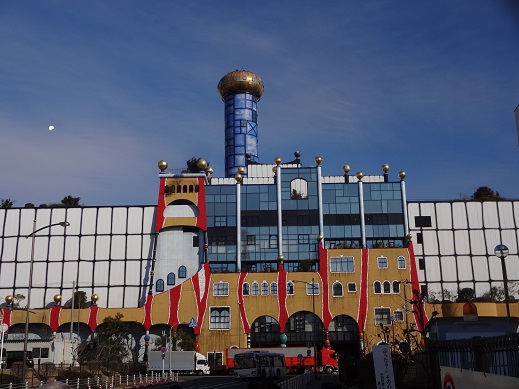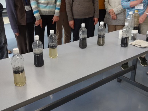 今日は大阪市の舞洲にある下水の汚泥処理施設「舞洲スラッジセンター」とごみの焼却施設「舞洲工場」を見学して環境対策の勉強です。メルヘンチックな建物から過去には近くにあるUSJと間違えて来る人もいたとか。そんな外観はオーストリアのフリーデンスライヒ・フンデルトヴァッサー氏のデザインで「技術、エコロジーと芸術の調和」をコンセプトに建てられています。スラッジセンターでは大阪市内8か所の下水処理場からパイプで送られてきた汚泥(スラッジ)を脱水し水分80%の汚泥ケーキにし、これを乾燥させ粉末状にして1,300~1,400℃で燃焼し溶融スラグにします。さらに急激に冷却して1/125の容積の砂状のスラグを作ります。このスラグは現在、夢洲(万博予定地)の埋め立てに利用しているそうです。汚泥ケーキを作る実験では、汚泥と高分子凝集剤が入った容器を手で振って水とケーキに分離させます。通常は1分間に1800回転の脱水機にかけると聞いて皆さん必死に振って汚泥ケーキを作りました。スラッジセンターの屋上からは六甲山から生駒山・金剛山までの稜線や大阪市内のビル群がきれいに見えます。海側から見られるのはここだけだそうで思わぬビューポイントに感動です。