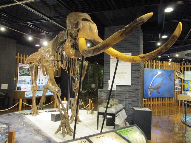 化石とは、過去の生物の体または生活の痕が地層中に保存されたもので、貝殻、骨、葉、微生物の骨格など様々な生物の化石があります。午前中は2班に分かれて自然資料館内の展示見学。ナウマンゾウの骨格標本、白亜紀(約8000万~6500万年)の海に生息していた海生爬虫類モササウルスなど詳しく説明していただいた。