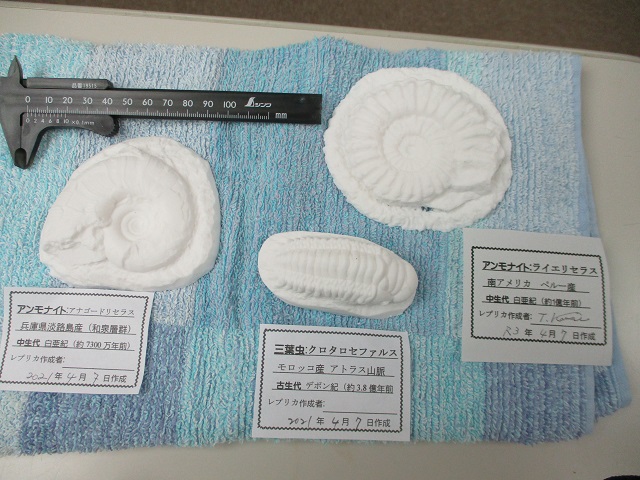 午後からは、シリコン製の型に石膏を流し込み化石のレプリカ造りを体験。固まるまでの時間を利用して釘と金づちを使って小さな貝の化石を取り出すことに挑戦。皆さん悪戦苦闘するもなかなか取り出すことは難しい様子で残り作業は持ち帰ってとなった。1年ぶりの座学で貴重な体験ができレプリカをお土産に講座終了(S.N)
