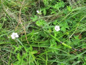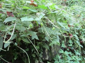 ・植物グループ・・・秋の花といえばハギ、細い花の茎にうすピンクの花がたくさんつくツルボ、かわいい果実をつけたスズメウリなど色々な草花を観察。長い階段を登った所にコモウセンゴケを発見。湿地や水のしみ出る崖などに生育するそうで、かわいい淡紅色の花も見ることができた。(S.N)
