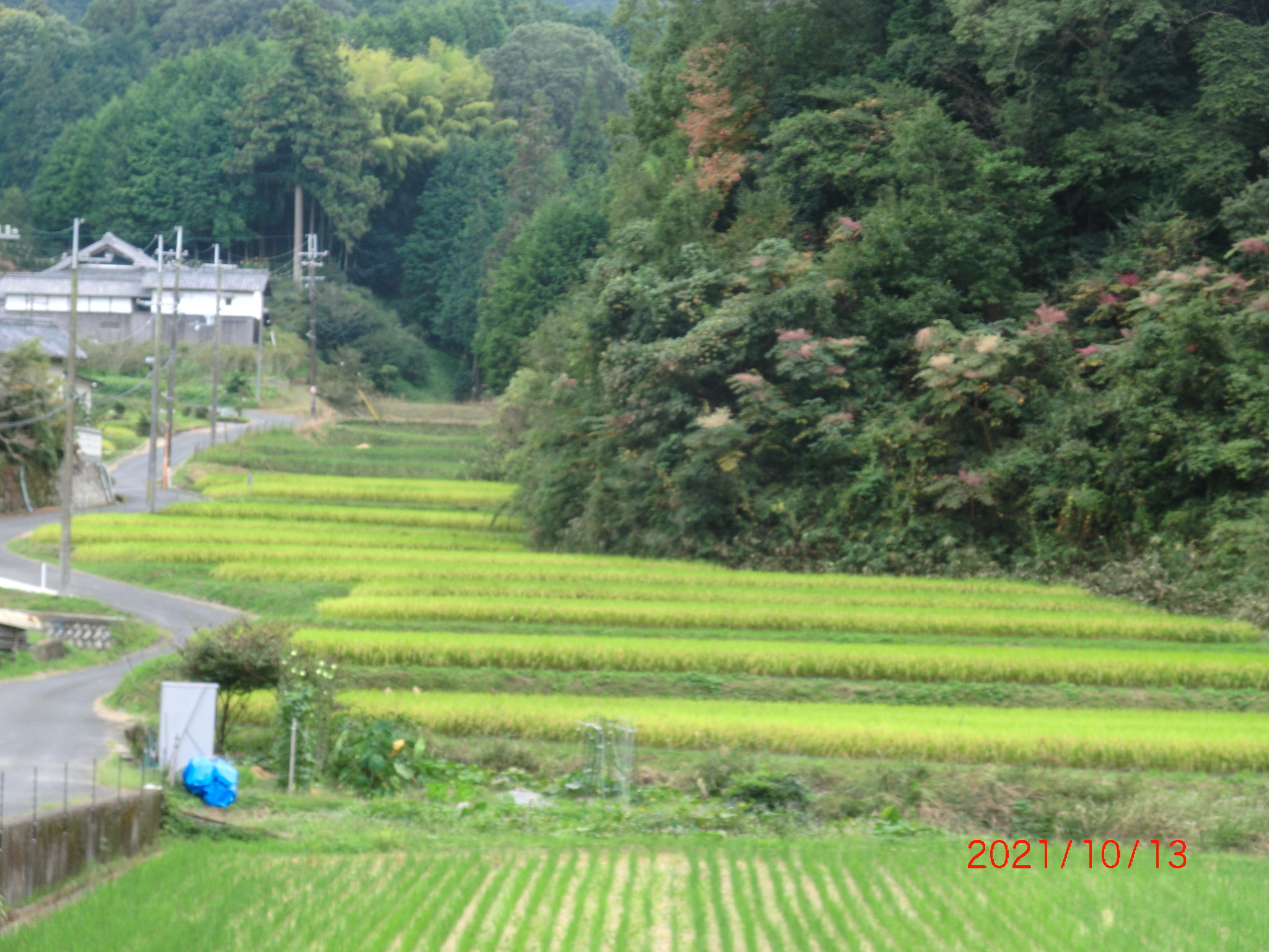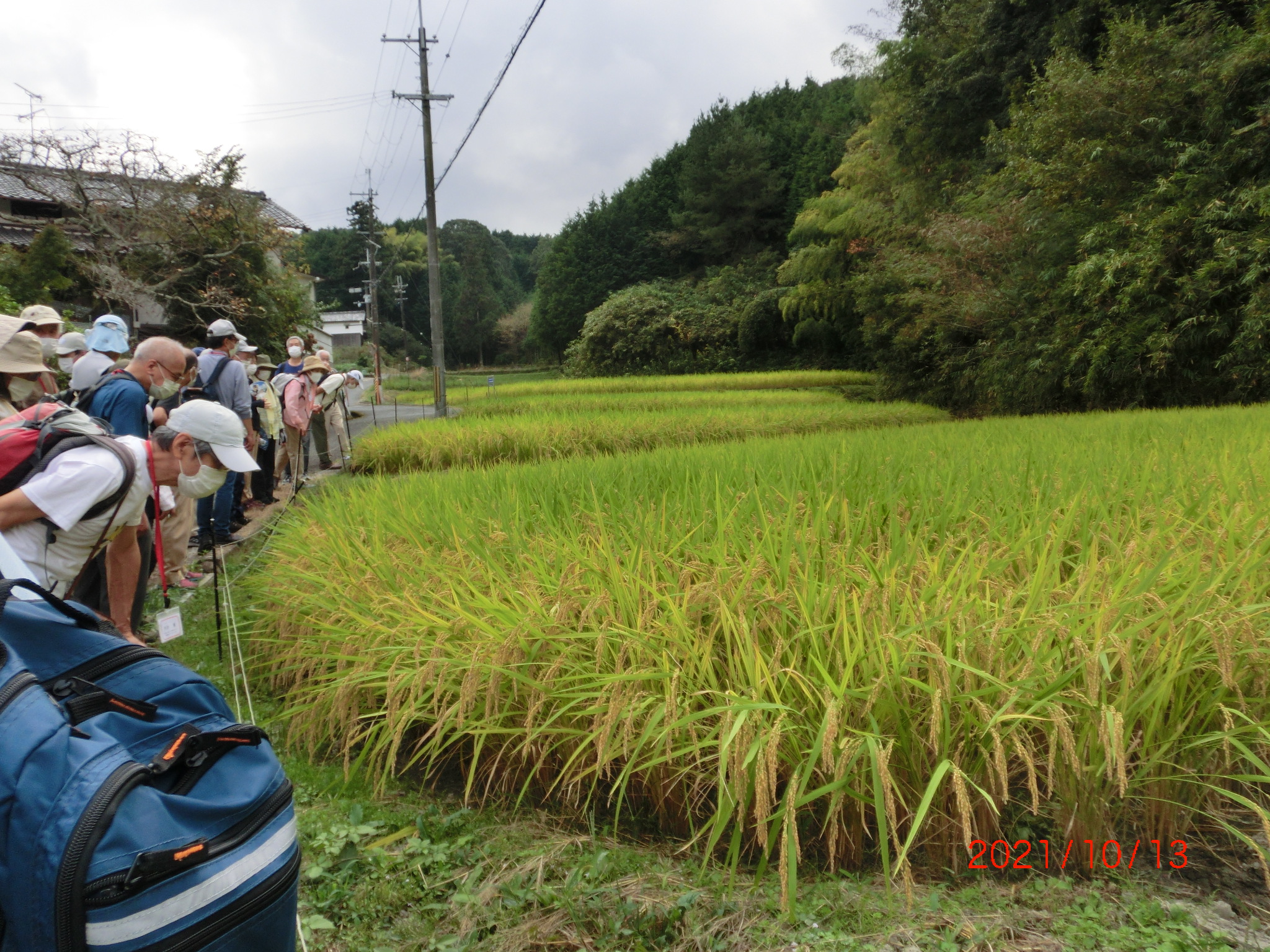 午後は電車で美加の台駅に移動し、徒歩で惣代の棚田へ向かった。殆どの田が落水していて、稲刈り直前と思われた。落水後10日~2週間干し、1割程度青い籾が残っているうちに刈り取るそうだ。既に刈った株からひこばえが出て実り始めているものもあり、見ることができた。刈り跡から機械で植えと手植えされた所もわかり、労働実態が見て取れた。蒸し暑い中、皆さん秋の草花や棚田の風景を見がらのウオーキングを楽しんでおられた。初めての内容の講座で、米作りの実態と美しい棚田の景観と価値を再認識した学習となった。