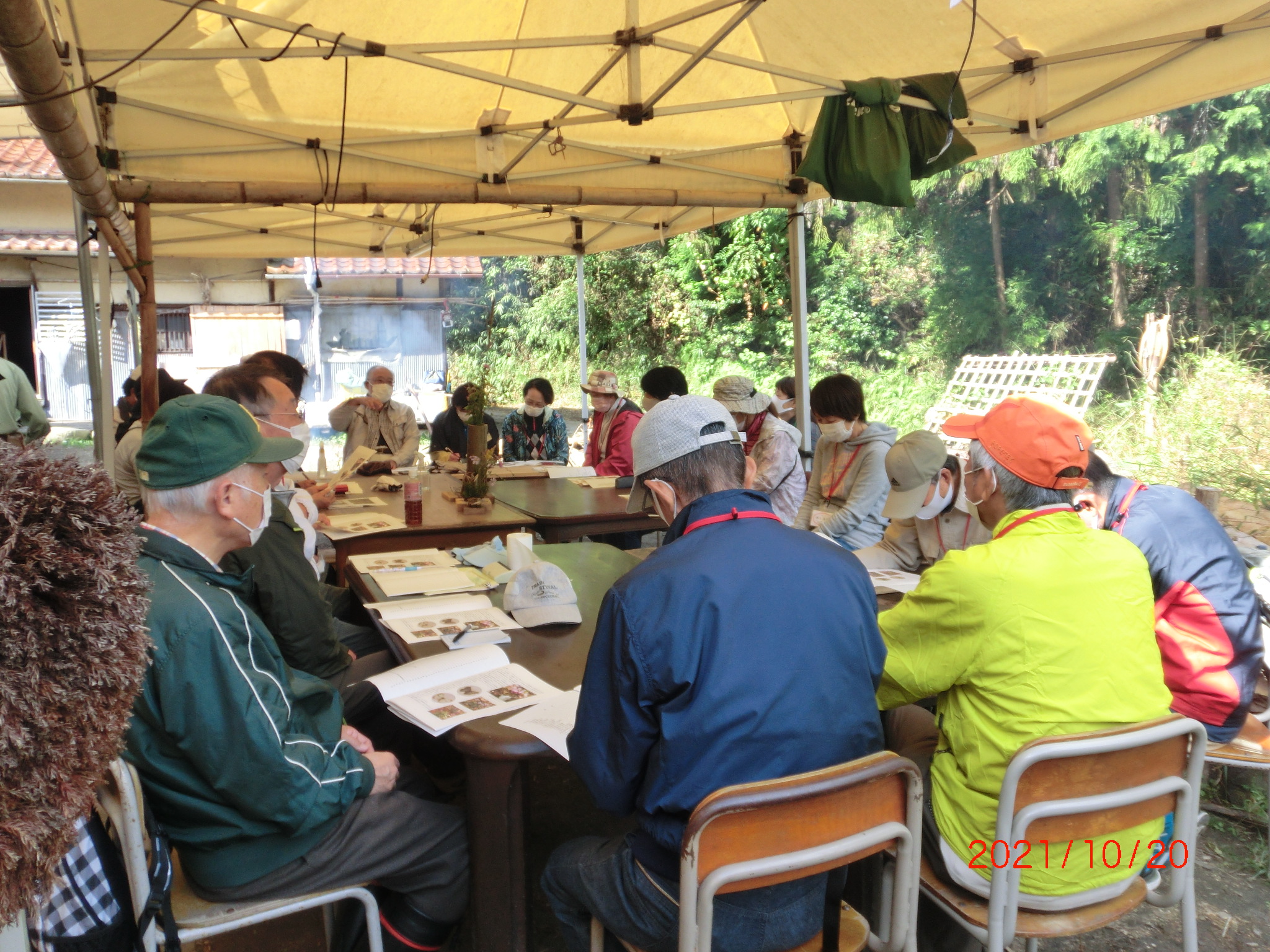 奥の谷は、滝谷不動尊から道を少し入った所に有る、小さな谷間です。例年、座学は建物の屋根裏部屋で、プロジェクターの画像を見て行っているが、今年はコロナ感染予防の為、外のテント下で行った。