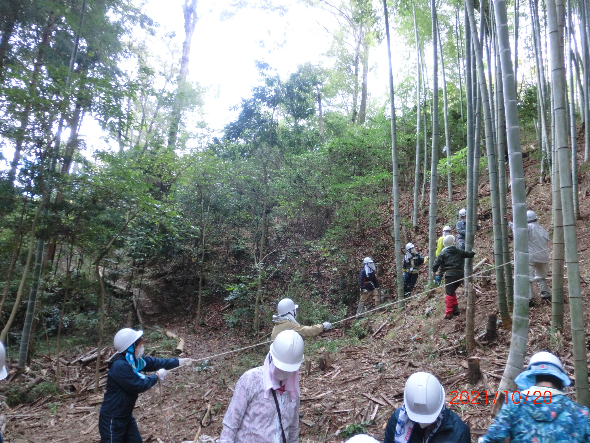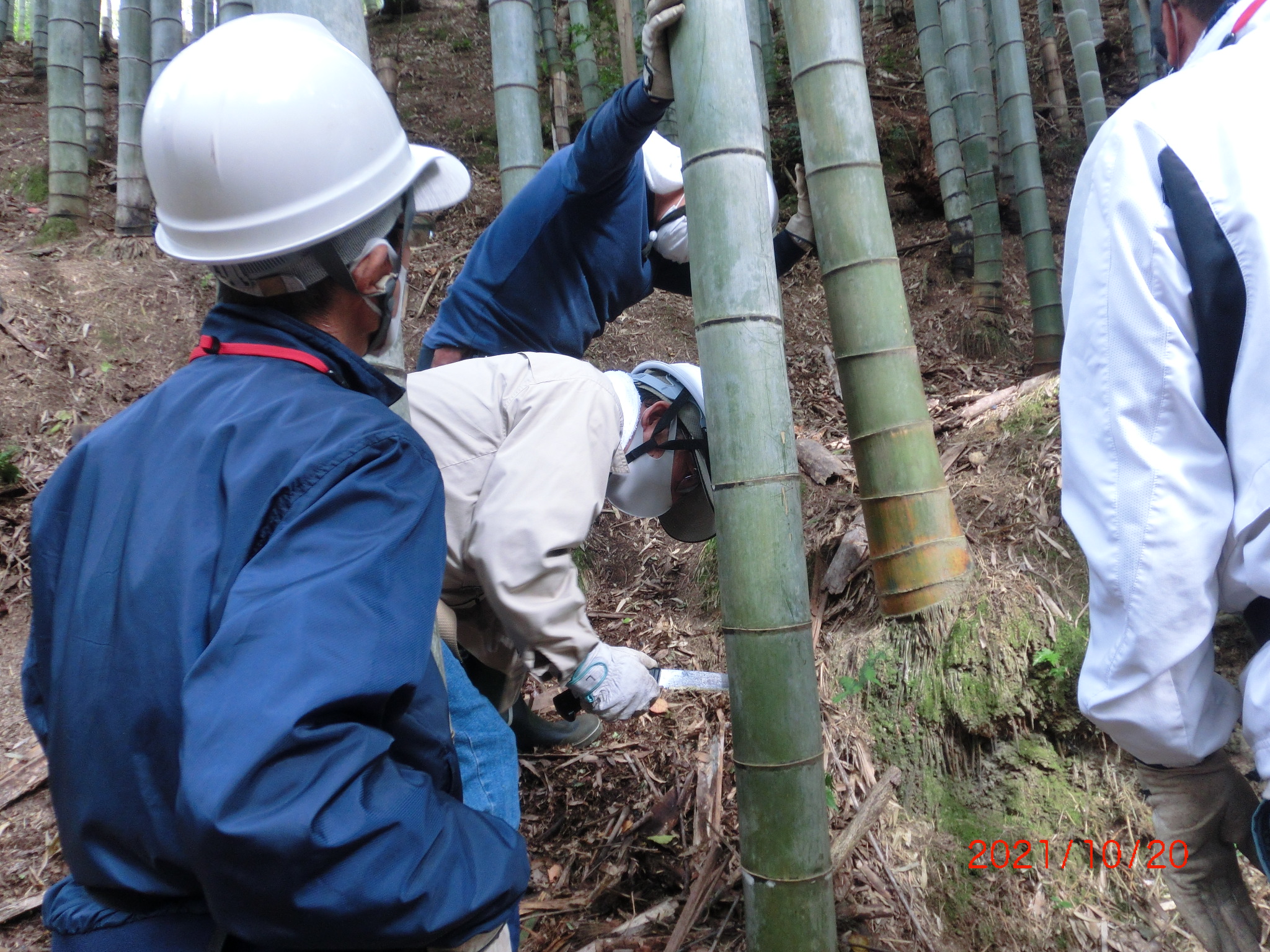 頂いた資料を見ながら、里山の成り立ちや保全活動のお話等から、なぜ間伐が必要なのかを聞くことが出来た。特に竹に関する問題は、高齢化等で竹藪が広がり続けており、周りの里山林を浸食していることだ。その後、山を歩いて、間伐前、間伐後の林を比べてみたり、竹が里山林に侵入しているのを見ると、座学での話が実感出来た。