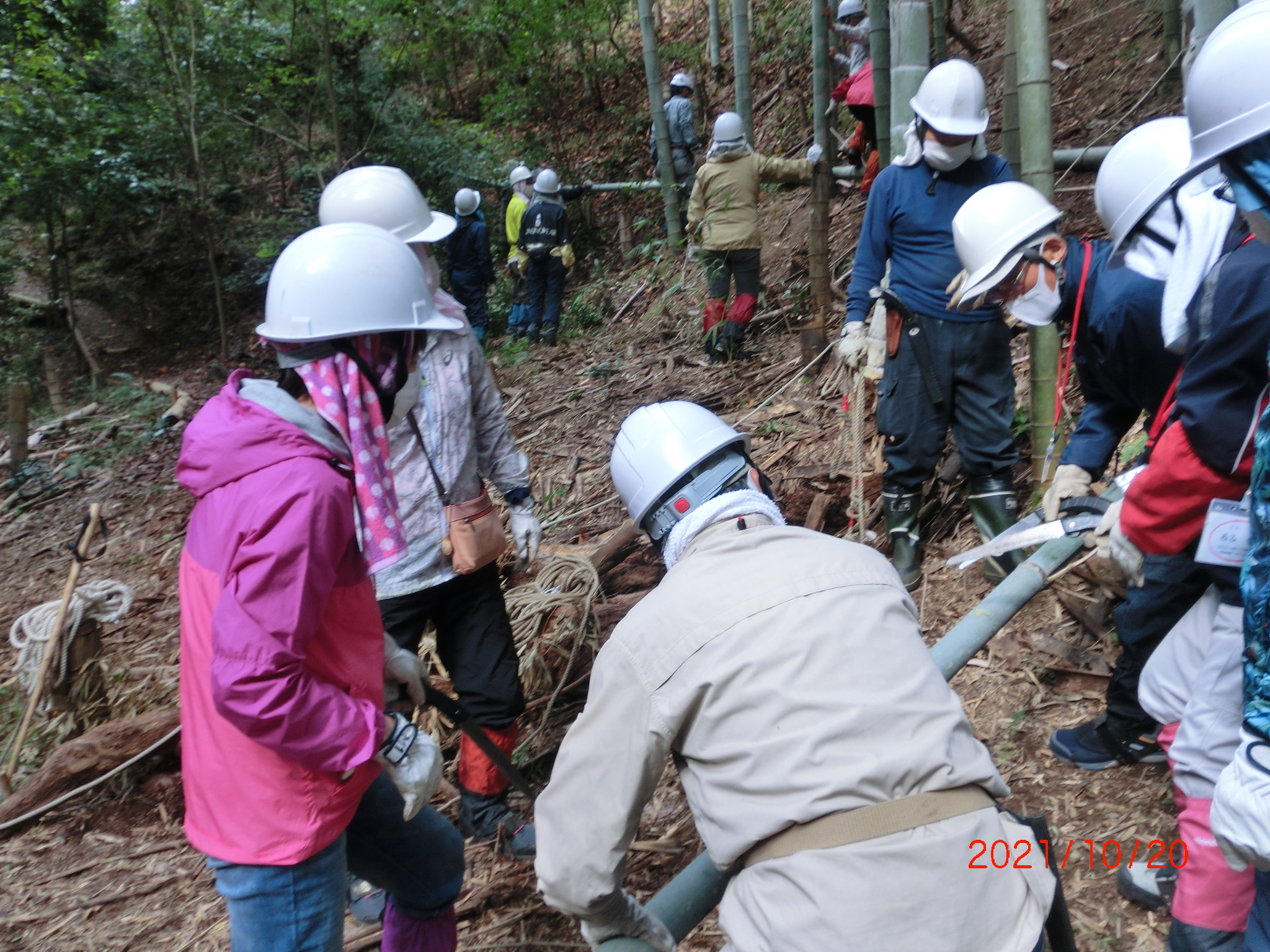 午後はいよいよ間伐だ。ヘルメット、アイゼン、スパッツ、革手袋、ベルト、ノコギリ等、慣れない装備に四苦八苦。全員装備完了、竹林に!三班に分かれて先ずは竹選び。倒す方向を決めて、ロープを掛け、人が居ないかを確認してから切り始める。「倒れるよー」の声の後、「わぁー」と大きな歓声が上がる。感動だ!切った竹は長くてとても重いので、3~4m位に切り分けて下の広場まで運んだ。間伐作業が終わった後、機械でチップにする作業も見学出来た。チップは肥料になるそうだ。